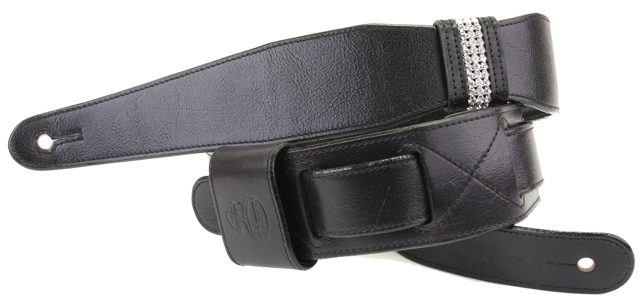 Ray černý kytarový popruh kombinuje ruční výrobu z Orlických hor s elegantními prvky Swarovski elements, což mu dodává unikátní třpyt a sofistikovanost.